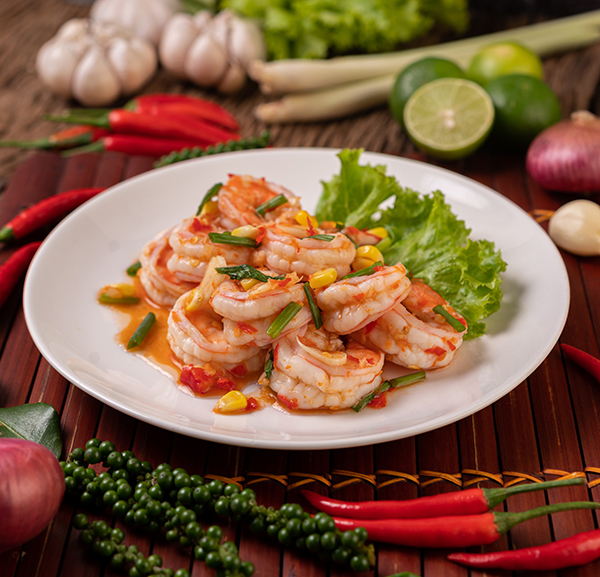 White shrimp salad with lettuce Corn and scallions, chopped.